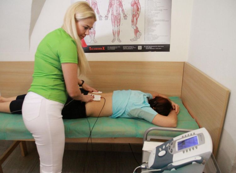 The procedure is performed with the help of the device in order to obtain an analgesic, congestive effect decreasing the muscle tone.